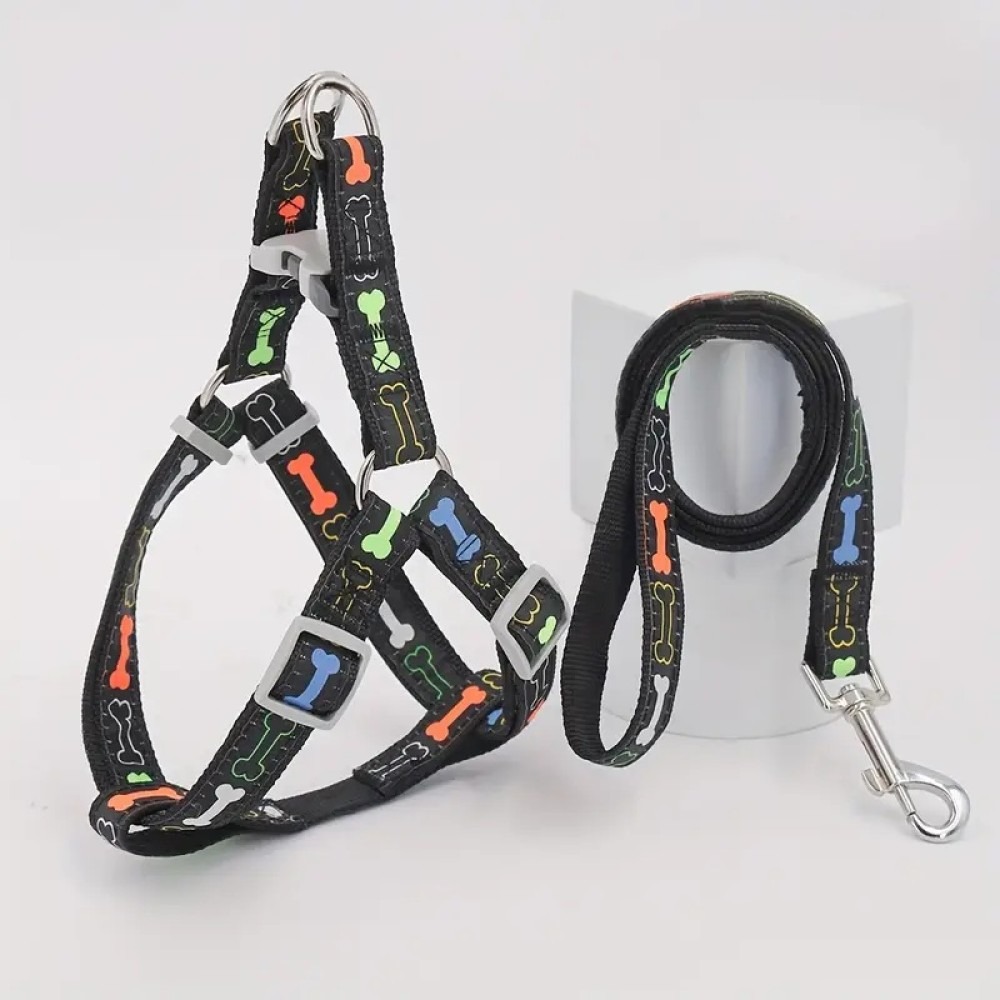 Állítható csont mintájú kutyahám és póráz szett,több színben – L – Fekete
