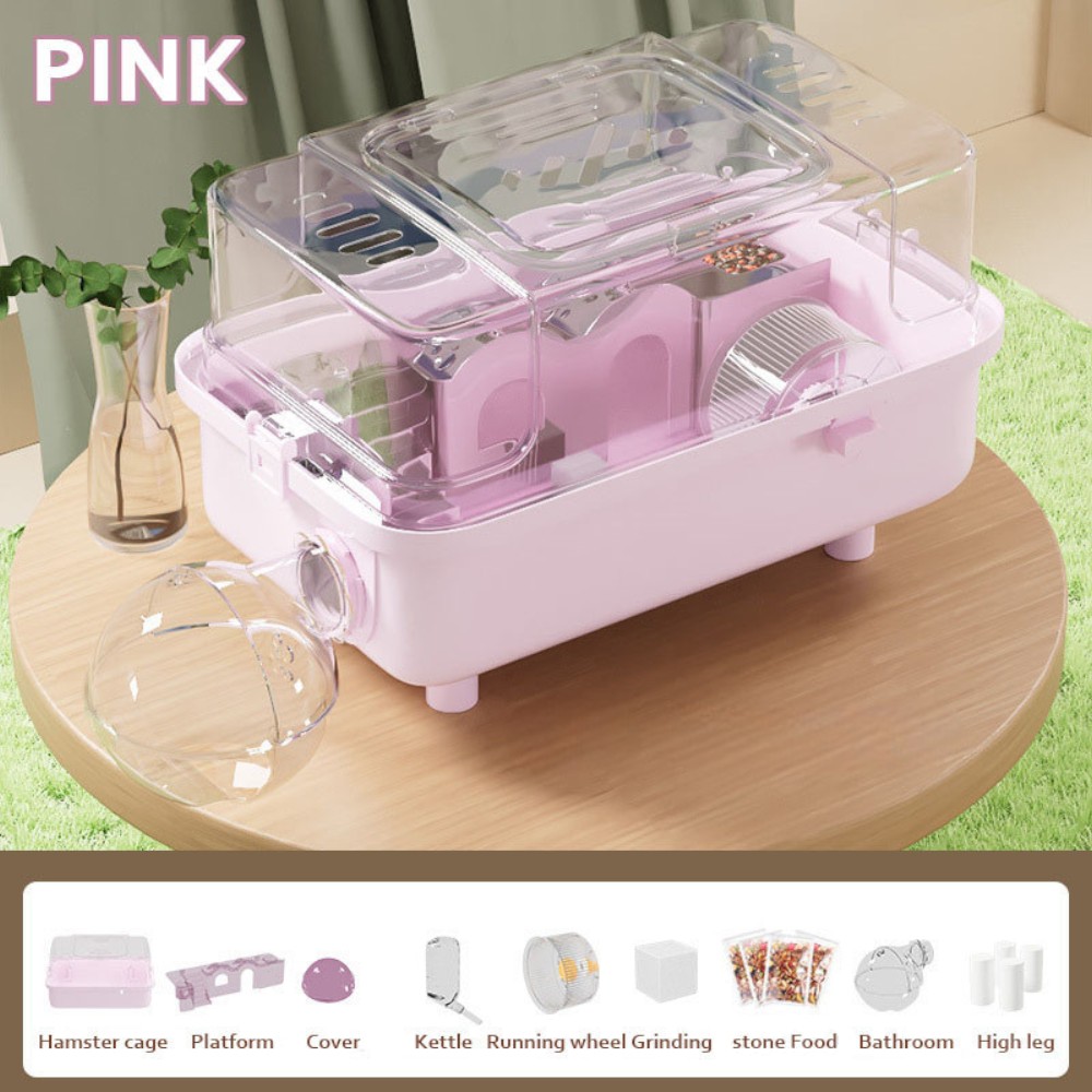 futókerék, búvóhely, etető, fürdőrész és csatlakoztatható átlátszó gömb, amelyek elősegítik az aktív mozgást, a játékot és a pihenést. A megemelt lábak javítják a szellőzést és megkönnyítik a tisztítást.