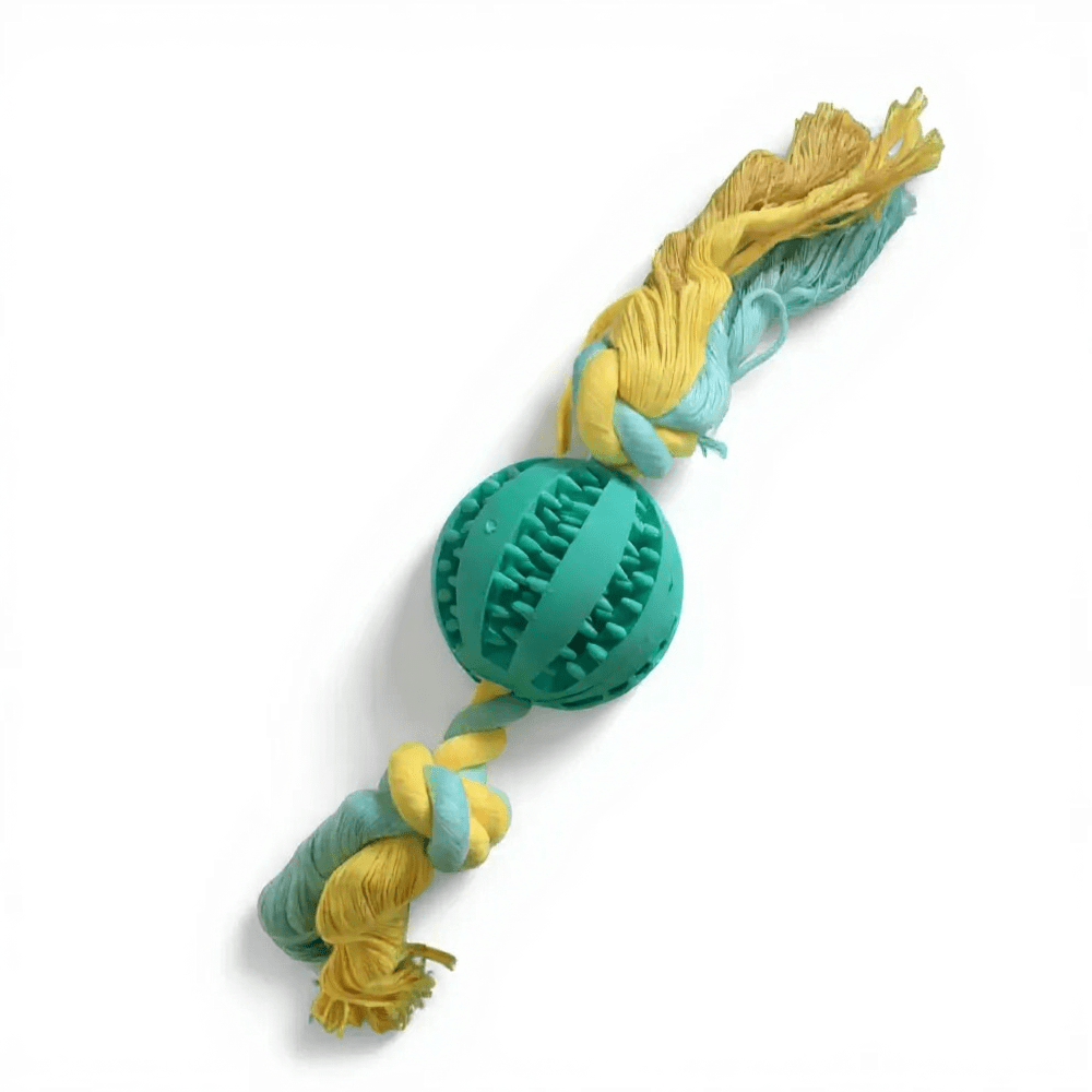 Ez a vanília illatú fogtisztító labda kötéllel nemcsak remek szórakozást nyújt kutyusodnak, de a fogak és az íny egészségét is támogatja. A strapabíró, rücskös felület tisztítja a fogakat játék közben, míg a kötél a közös huzigálós játékhoz tökéletes.